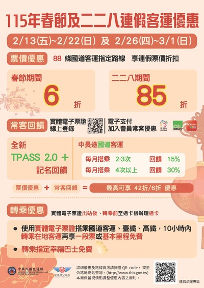115年春節及228連假搭乘公路公共運輸享有多項優惠,請多加利用