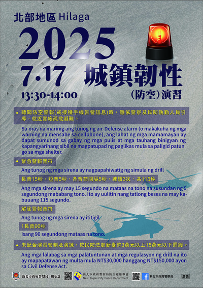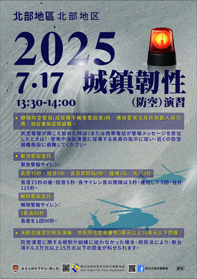 2025城鎮韌性(防空)演習訂於114年7月17日13時30分至14時實施,請各位鄉親配合管制相關措施。