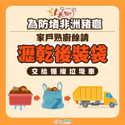 3. 家戶熟廚餘請瀝乾裝袋交給循線垃圾車,守護豬豬從你我做起。